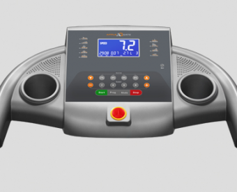 Тренировочный компьютер представлен голубым дисплеем диагональю 12,5 см. На экран одновременно выводятся все основные параметры тренировки – время, скорость, дистанция, потраченные калории, угол наклона и пульс. В программный пакет входят 9 предустановленных программ, направленных на тренировку скоростных качеств, выносливости, укрепления сердечно-сосудистой системы и похудания. Помимо предустановленных программ, можно воспользоваться самостоятельно регулируемым ручным режимом. Для считывания показаний пульса в поручни дорожки вмонтированы контактные сенсорные датчики. Там же находятся так называемые "быстрые клавиши" управления, благодаря им можно отрегулировать скорость или угол наклона, не снимая рук с поручней. К другим особенностям дорожки относятся двухфазная гидравлическая система складывания soft-Drop™, которая существенно облегчает складывание дорожки, а при раскладывании обеспечивает медленное опускание полотна в последней фазе, гарантируя легкость и безопасность. Развлекательная мультимедийная компонента представлена колонками мощностью 3 ватта и входом Audio IN для воспроизведения аудио файлов от подключаемых MP3-проигрывателей или смартфонов. Перемещение дорожки происходит за счет 2-х транспортировочных роликов.